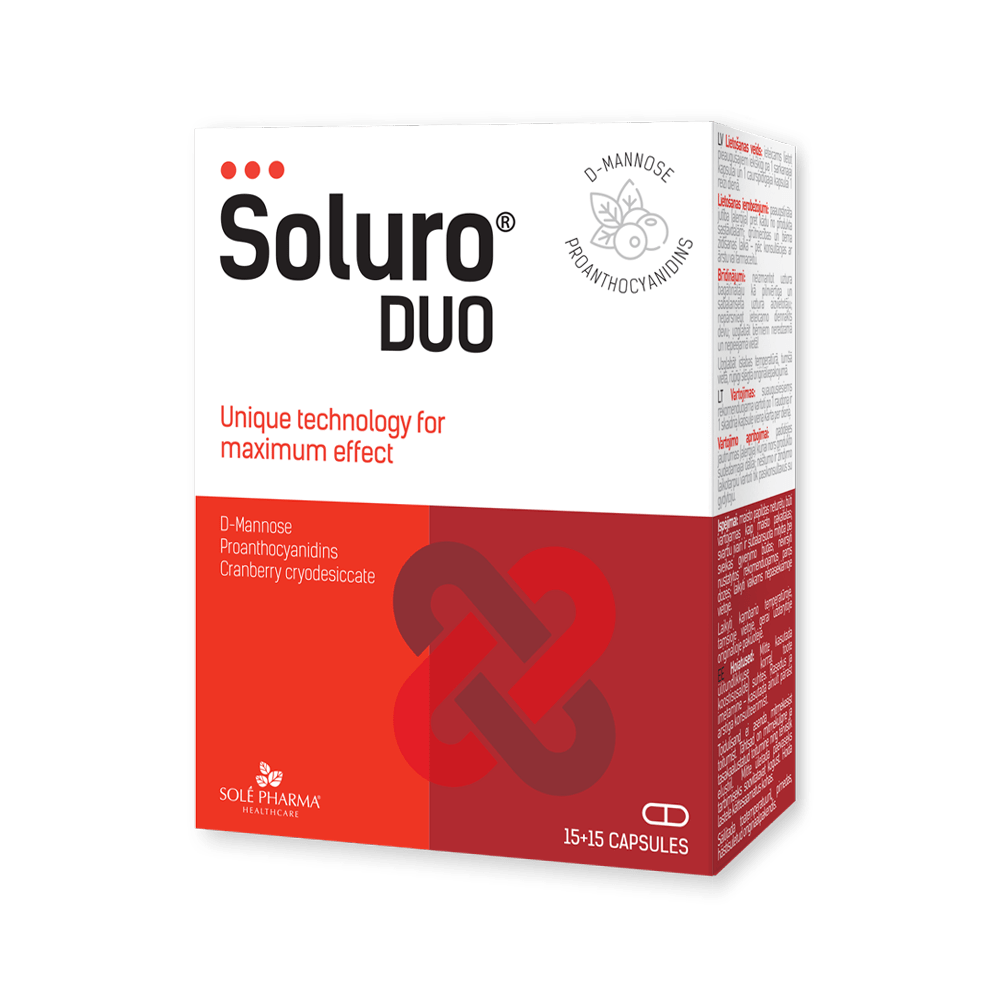 Unikali spanguolių koncentratų proantocianidinų (PAC) ir D-manozės kombinacija, esanti Soluro Duo kapsulėse, veiksmingai blokuoja visas cistitą sukeliančių bakterijų sukibimo sąaugas. Tai neleidžia patogeninėms bakterijoms prilipti prie šlapimo pūslės gleivinės ir įsiskverbti į ląsteles, taip užkertant kelią cistito vystymuisi.