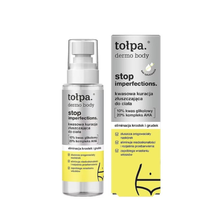 Tołpa Dermo Body AHA šveičiamasis purškiklis yra intensyvaus poveikio kūno valymo priemonė, veikianti kaip rūgštinis eksfoliantas, turinti 10% glikolio rūgšties ir 20% AHA kompleksą. Ši efektyvi formulė padeda išlyginti odos paviršių, šalinant nelygumus ir pigmentacijos pokyčius. Reguliarus naudojimas padeda reguliuoti sebumo išsiskyrimą nugaros, pečių, dekoltė ir sėdmenų srityse, apsaugo nuo naujų odos trūkumų susidarymo.