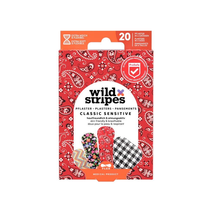 Wild Stripes Classic Sensitive fashion – tai ES atitinkantis medicininis produktas, kuris siūlo daugiau nei tik apsaugą. Šie linksmi raštai ir pastelinių spalvų raišteliai kiekvieną dieną suteikia pozityvumo, tuo pačiu užtikrindami patikimą mažų žaizdų apsaugą. Rinkinys puikiai tinka jautrią odą turintiems žmonėms – raišteliai yra odai draugiški, hipoalerginiai ir užtikrina itin stiprų sukibimą, net esant aktyviam gyvenimo būdui.