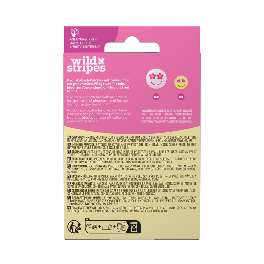 Šypsokitės be rūpesčių! Wild Stripes® Smile Stop spuogų pleistrai yra spalvoti ir žaismingi sąjungininkai kovoje su spuogais – madingi ir efektyvūs. Šie pleistrai, pagaminti iš hidrokoloidų ir hialurono rūgšties, ramina odą, diskretiškai dengia spuogus ir drėkina odą, padedant natūraliai atsistatyti.