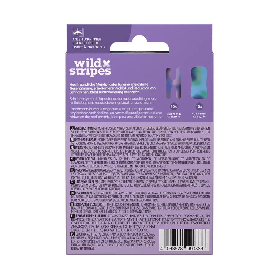 „Wild Stripes® Sunset“ burnos pleistrai sukurti siekiant padėti jums pasiekti gilesnį ir atstatantį miegą. Šie odai draugiški pleistrai skatina kvėpavimą per nosį ir padeda sumažinti kvėpavimą per burną bei su tuo susijusį knarkimą. Rezultatas – ramesnė naktis ir energingesnis pabudimas.