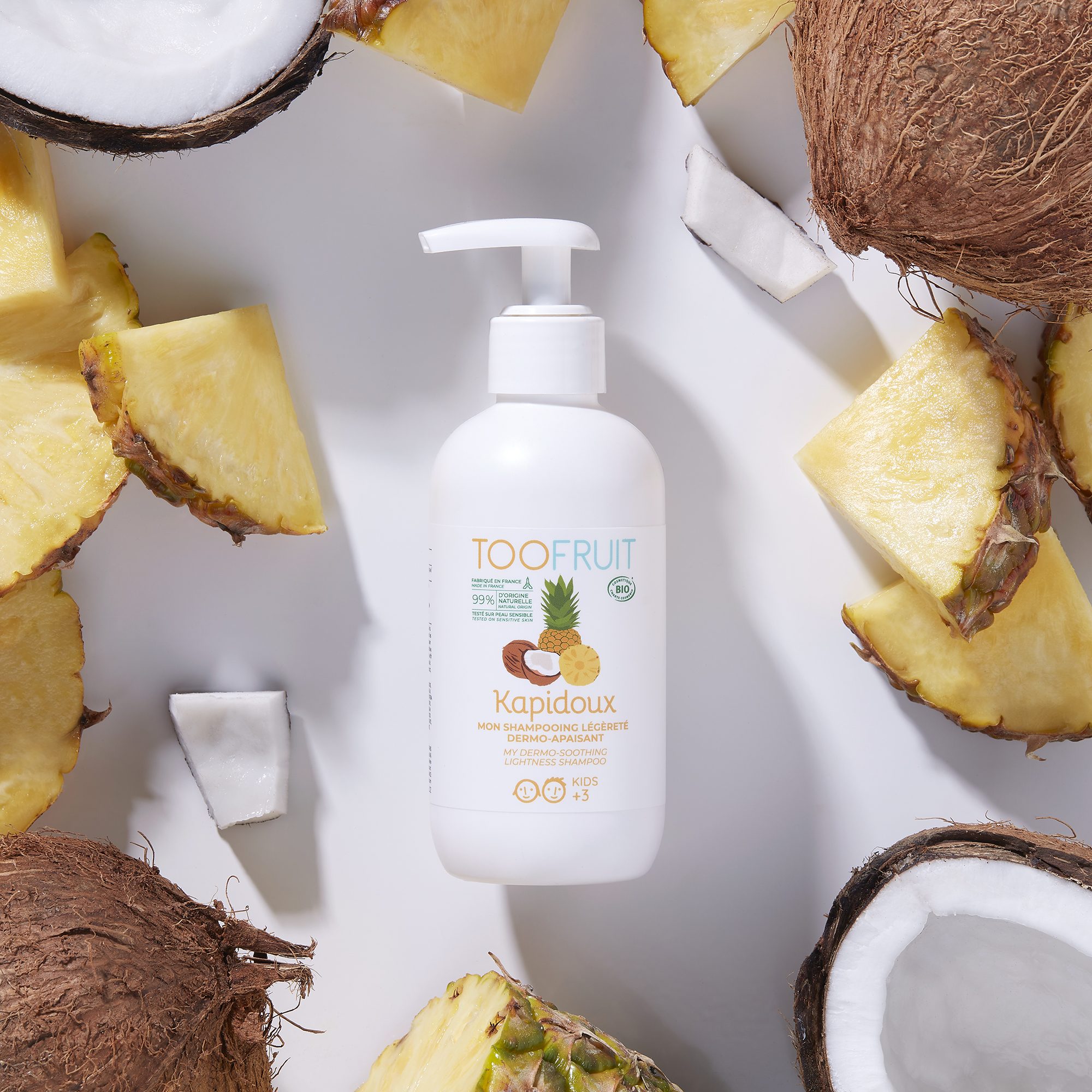 Kapidoux kokosų-ananasų šampūne esančios paviršinio aktyvumo medžiagos švelniai valo plaukus ir galvos odą, puikiai pašalina nešvarumus neapsunkindamos vaiko jautrios galvos odos. Glicerinas padeda drėkinti galvos odą, o jogurto milteliai lengvina plaukų priežiūrą ir šukavimą. Galiausiai, alavijo ekstraktas ramina galvos odą, o saldžiųjų migdolų ekstraktas natūraliai apsaugo ir drėkina plaukus. Kapidoux šampūnas praturtintas ekologišku saldžiųjų migdolų aliejumi, ekologišku taukmedžių sviestu, ekologišku obuolių vandeniu, ekologišku alaviju ir argininu, todėl net sausiausi plaukai tampa šilkiniai ir glotnūs!