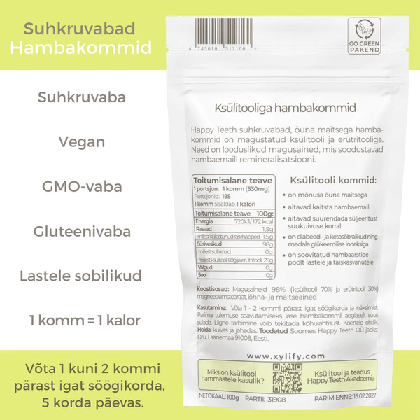 Draugiškumas aplinkai: Produktas supakuotas į biologiškai skaidžią pakuotę, kuri tinkamomis sąlygomis suskyla į natūralius komponentus. Tai padeda sumažinti atliekų kiekį ir aplinkos naštą. „Happy Teeth“ ksilitolio dantų pastilės rūpinasi ir dantimis, ir gamta.